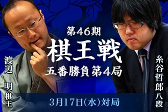 渡辺明棋王に糸谷哲郎八段が挑戦する第46期棋王戦五番勝負の第4局が3月17日(水)に東京都渋谷区の「東郷神社」で行われ、渡辺棋王が98手で糸谷八段を破り、五番勝負の成績を3勝1敗として棋王位を防衛しました。渡辺棋王は棋王戦9連覇となります。